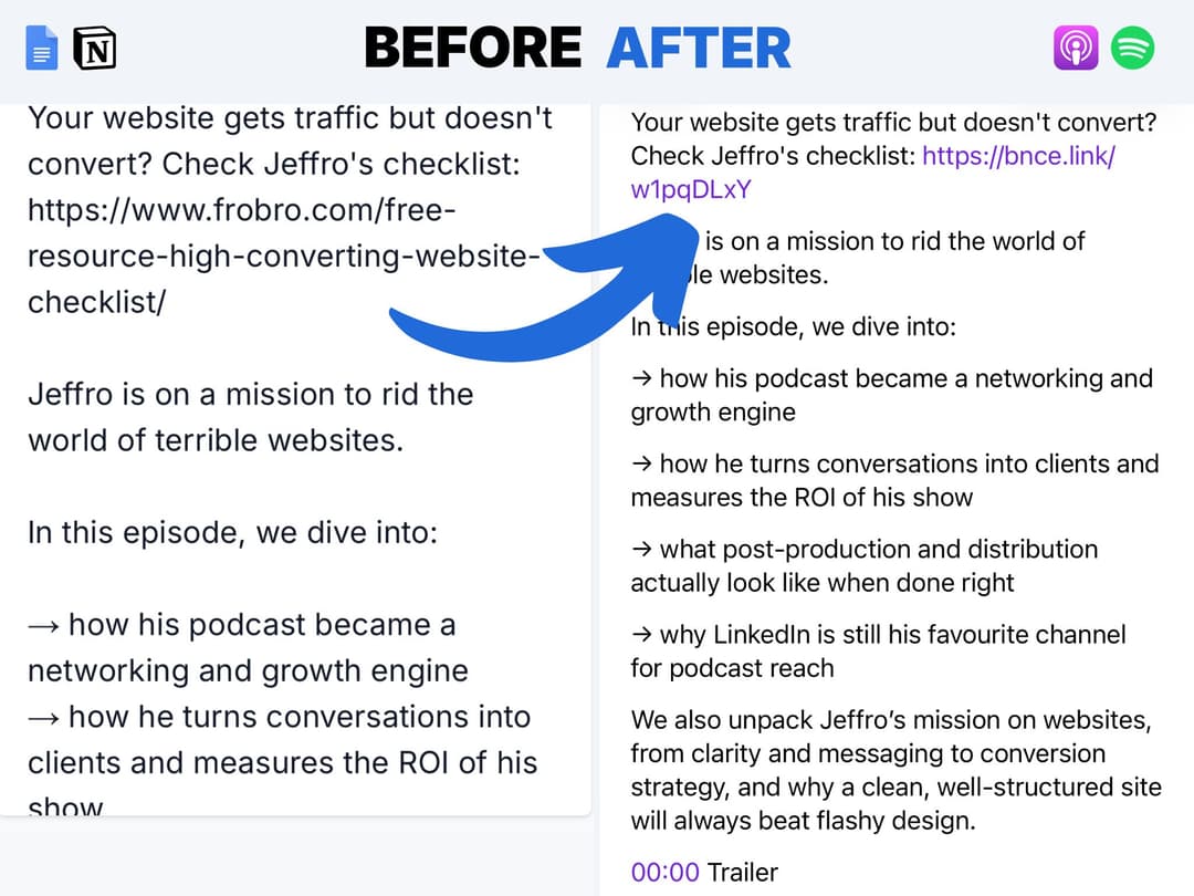 Before releasing your podcast episode, use bouncelink to get links in your show notes replaced with bounce links.